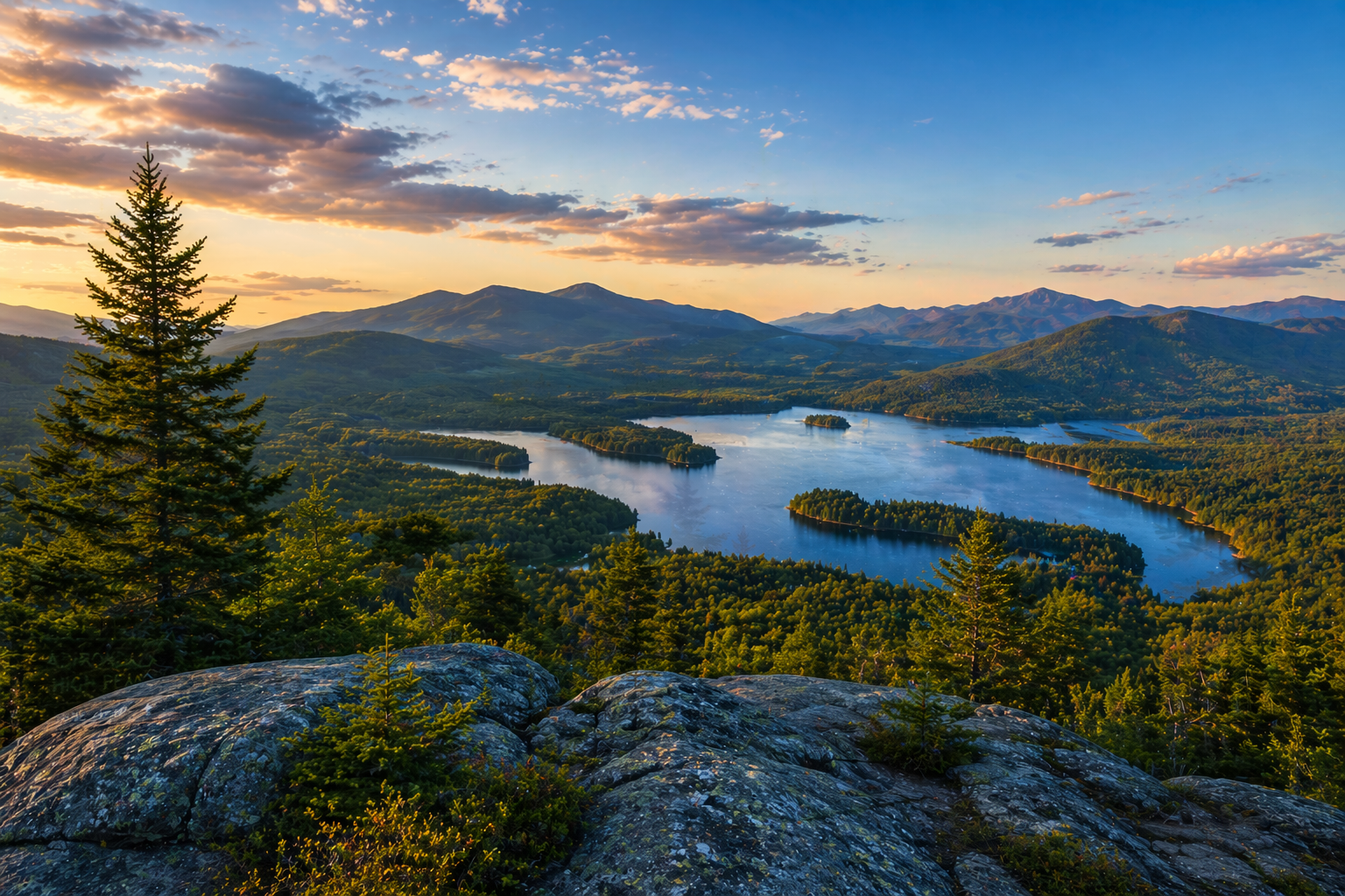 Six million acres — the largest publicly protected area in the lower 48. High Peaks, glacial lakes, and classic Great Camps wrapped around villages like Lake Placid and Saranac Lake.
